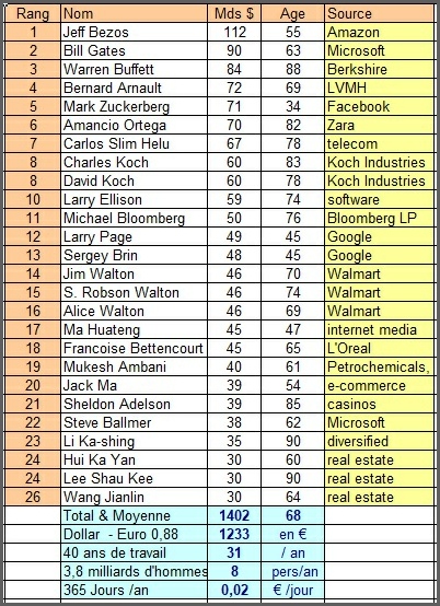 Chaque année la fortune cumulée de ces 26 milliardaires s'est accrue en moyenne de 31 milliards € (1233 / 40 = 31 milliards €).