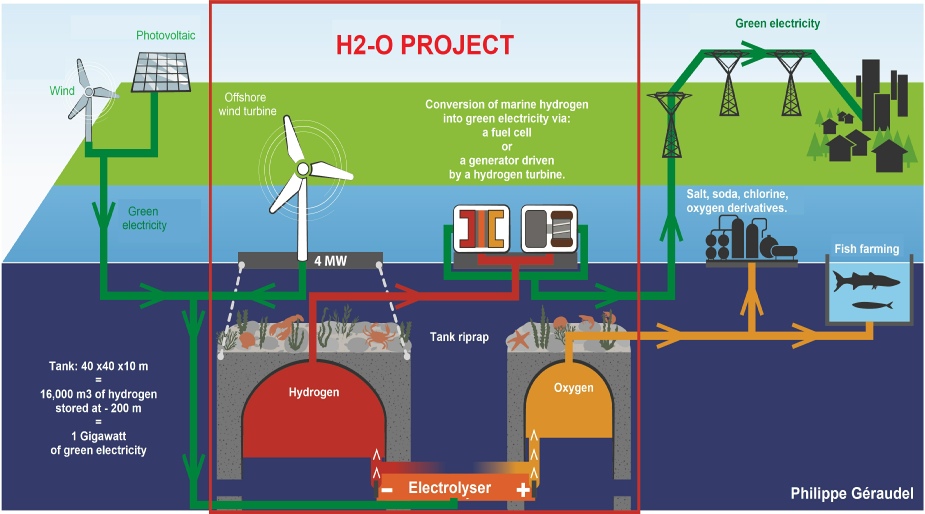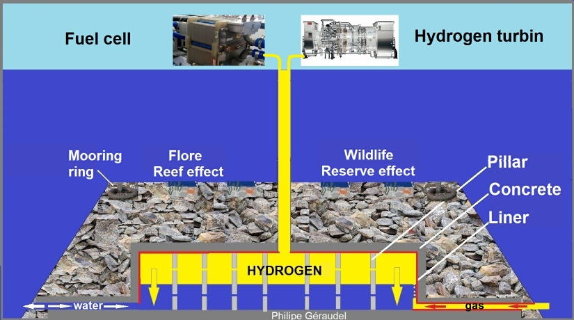 This stored hydrogen, under pressure under seawater, in very cheap concrete tanks will then be transformed locally into green electricity via a fuel cell or a hydrogen turbine coupled to a generator.