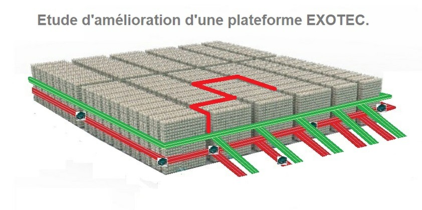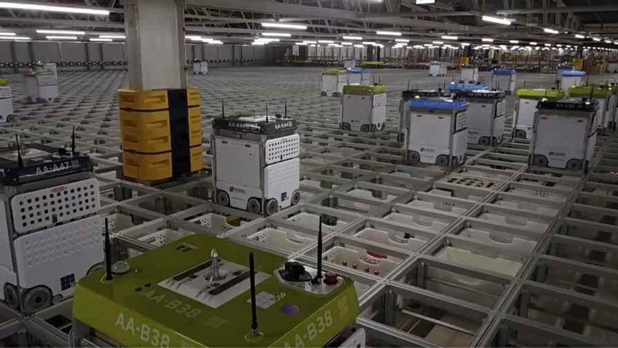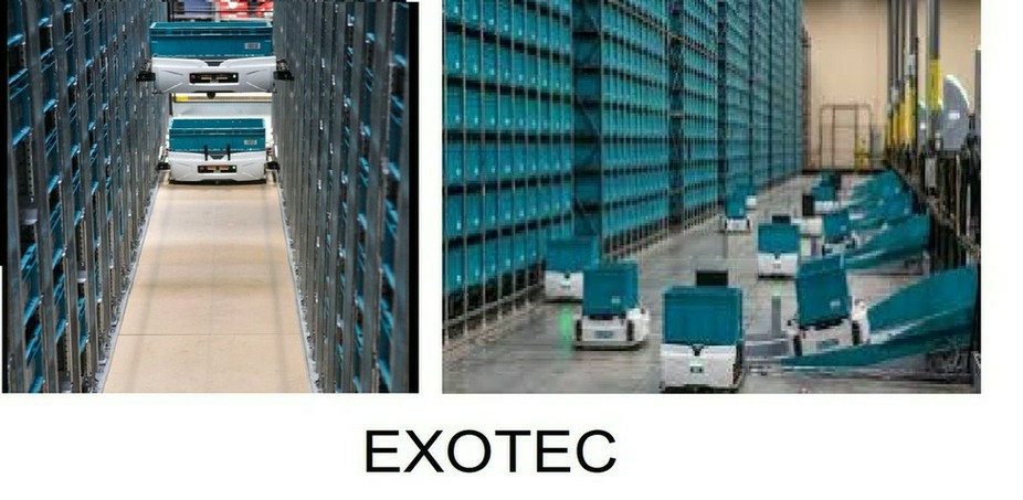 On évite ainsi aux navettes d’avoir à se déplacer au sol tout en simplifiant leurs trajectoires.(Exotec, Amazon...)