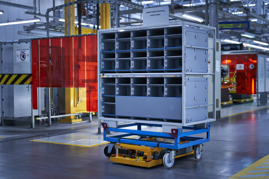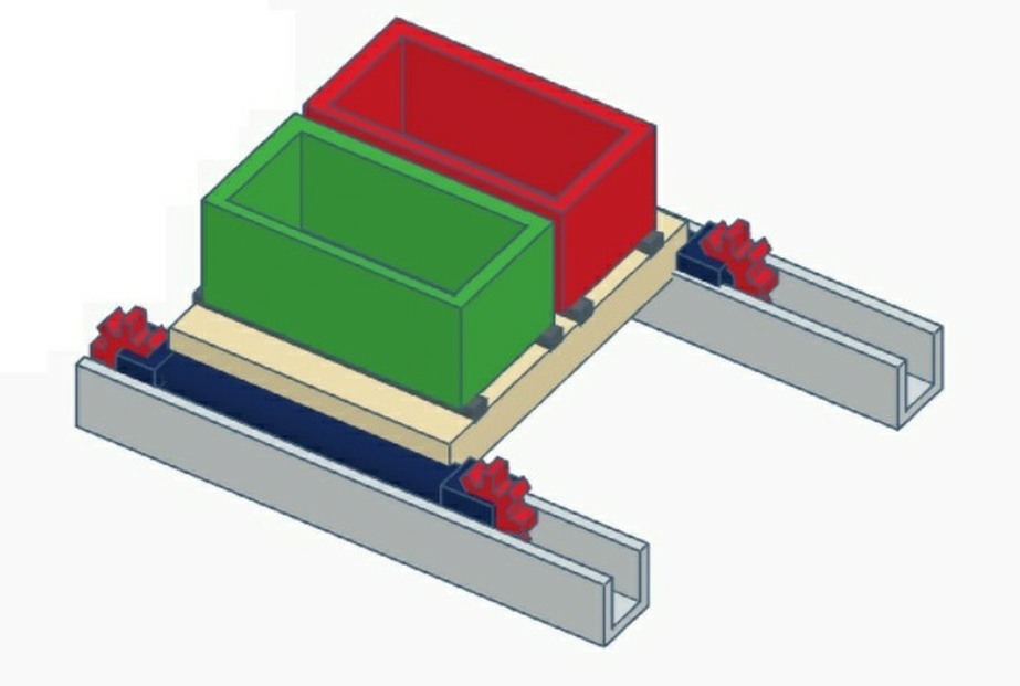 Le robot 6 D+ est conçu pour transporter un ou deux bacs côte à côte : un bac rouge contenant le stock et un bac vert contenant les articles de la commande avec la possibilité de transférer les articles d’un bac à l’autre à l’aide d’un robot de picking mobile.