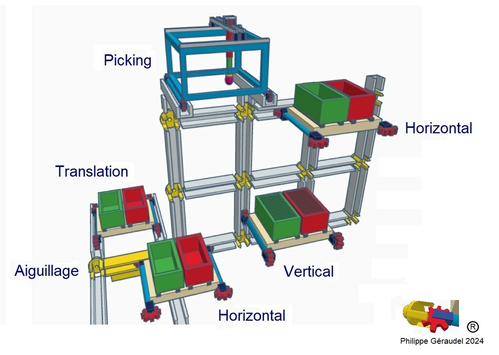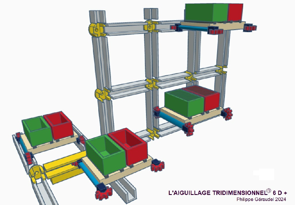Son système innovant d'aiguillage tridimensionnel , lui permet de changer d’allées sans jamais avoir besoin de rouler au sol ni quitter les racks.